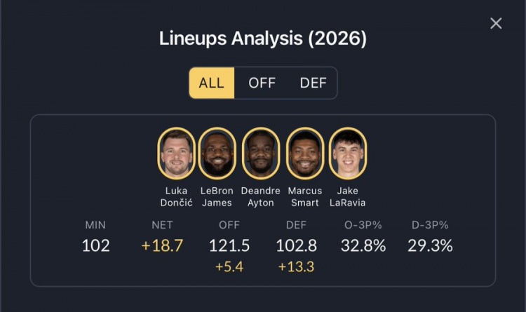 直播吧1月15日讯 湖人近期派出的首发阵容是:东契奇、斯玛特、拉拉维亚、詹姆斯和艾顿。
