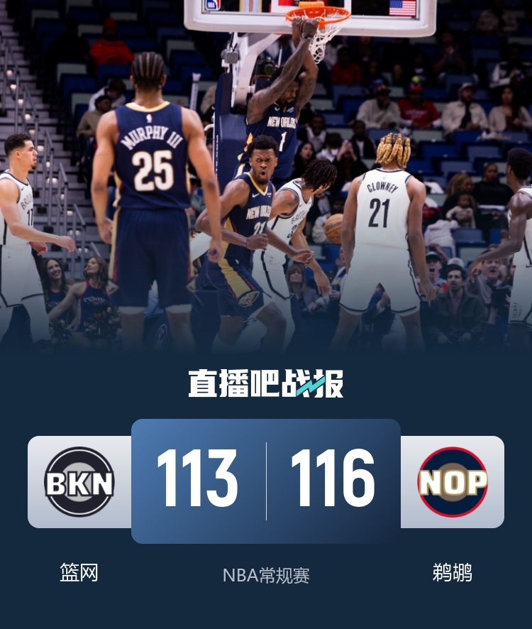 比赛开场,篮网率先发力,波特继续展现自己的进攻能力,外线三投全中,帮助球队一度领先到两位数,不过随后鹈鹕打出一波11-1蚕食分差,首节结束篮网31-27领先。次节回来,墨菲和普尔连续在外线发炮,篮网这边杰明也是屡屡做出回应,双方陷入拉锯战,半场结束篮网55-54领先1分。易边再战,锡安开始发力,在篮下予取予求,单节6中6砍下14分,帮助鹈鹕取得反超,篮网也不甘示弱,众人发力,双方依旧是交替取分,节末托马斯连中两记三分,双方87平进入第四节。末节回来,篮网延续势头打出一波7-0建立领先,不过墨菲登场后连续取分帮助鹈鹕回应一波9-0再次反超,此后双方再次陷入拉锯战,悬念维持到最后一刻,萨迪克·贝连突带投拿下5分,帮助鹈鹕在比赛还剩20秒时领先2分,随后墨菲造成犯规两罚全中,但鲍威尔三分命中维持悬念,最后波特压哨三分不中,比赛结束,鹈鹕116-113险胜篮网。
