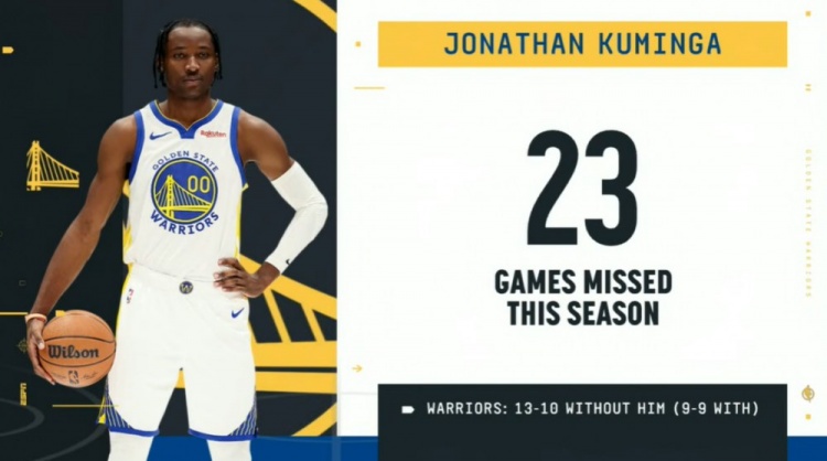>申请交易!本季库明加已缺席23场期间勇士13胜9负 出战时为9-9