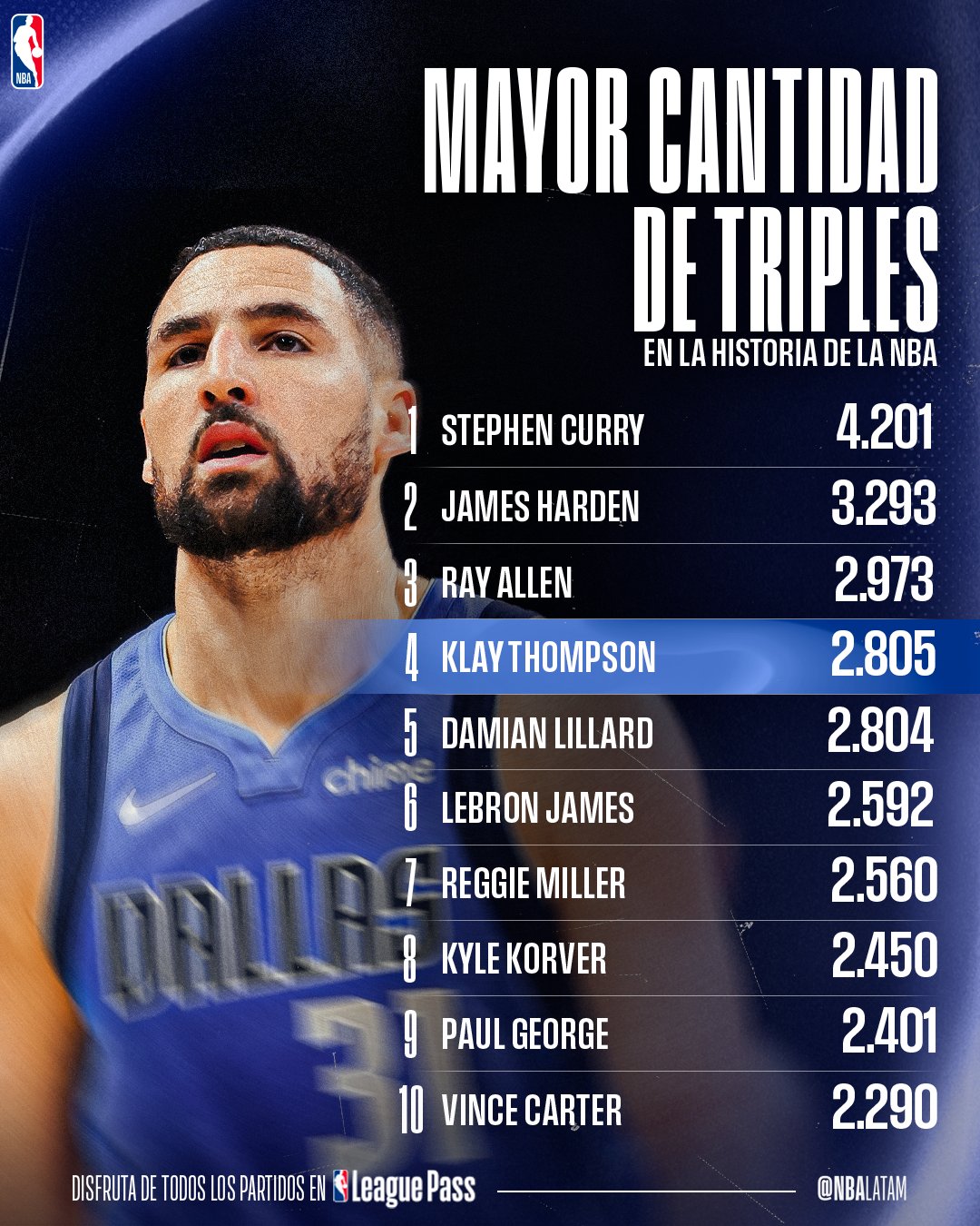 克莱职业生涯命中2805记三分 却只出手了1806记罚球