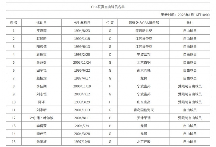 直播吧1月16日讯 CBA官网更新自由球员名单,深圳老将罗汉琛在列。