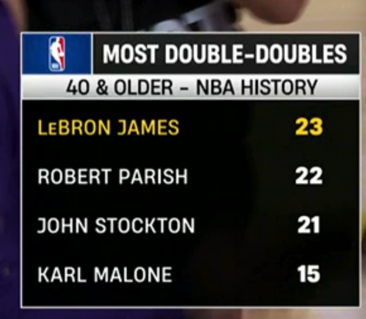 转播方给出一组数据,詹姆斯在40岁后已经得到23次两双,NBA历史最多,详情如下: