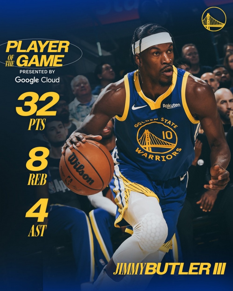 赛后,勇士官方发布本场最佳数据海报:吉米·巴特勒当选。