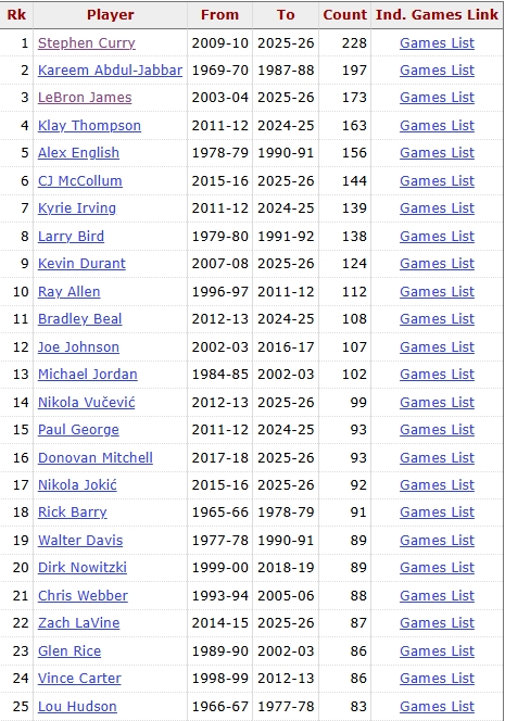 这也是库里职业生涯第229次在不足5记罚球的情况下229次砍下至少25分,其余NBA球员均没达到200次。