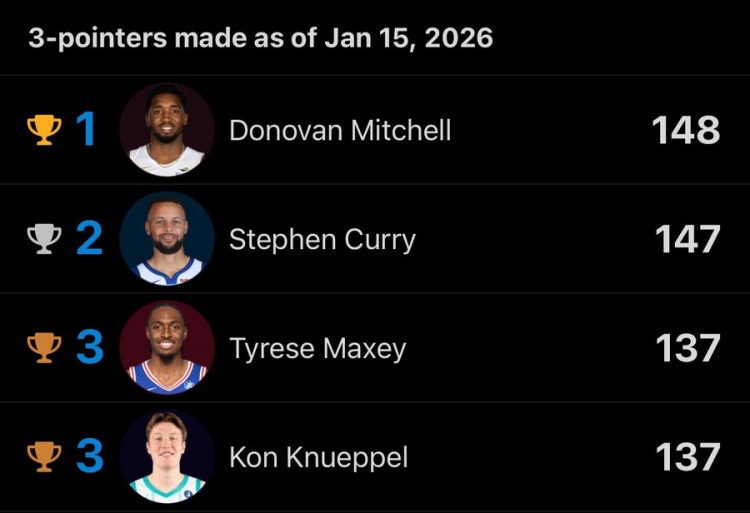 >三分命中榜:米切尔148记 库里147记 马克西&克尼佩尔137记
