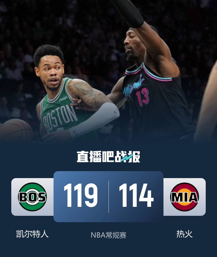 比赛开始,凯尔特人开局慢热半节仅得4分,热火多点开花轰出15-0攻击波一举建立领先,A·西蒙斯接连3记三分追分,首节热火领先11分,次节双方展开拉锯战,凯尔特人依靠替补球员一度追到个位数分差,但希罗连得7分回应,热火半场还是领先10分。下半场,布朗进攻端回暖,连续突破单节15分追分,但热火多点开花始终能回应,热火三节还领先10分,末节绿军8-2咬住比分,随后西蒙斯和豪泽连续三分终于反超比分,双方展开胶着拉锯战,豪泽关键补篮绿军挑战成功,西蒙斯两罚杀死比赛,最终凯尔特人119-114逆转热火。