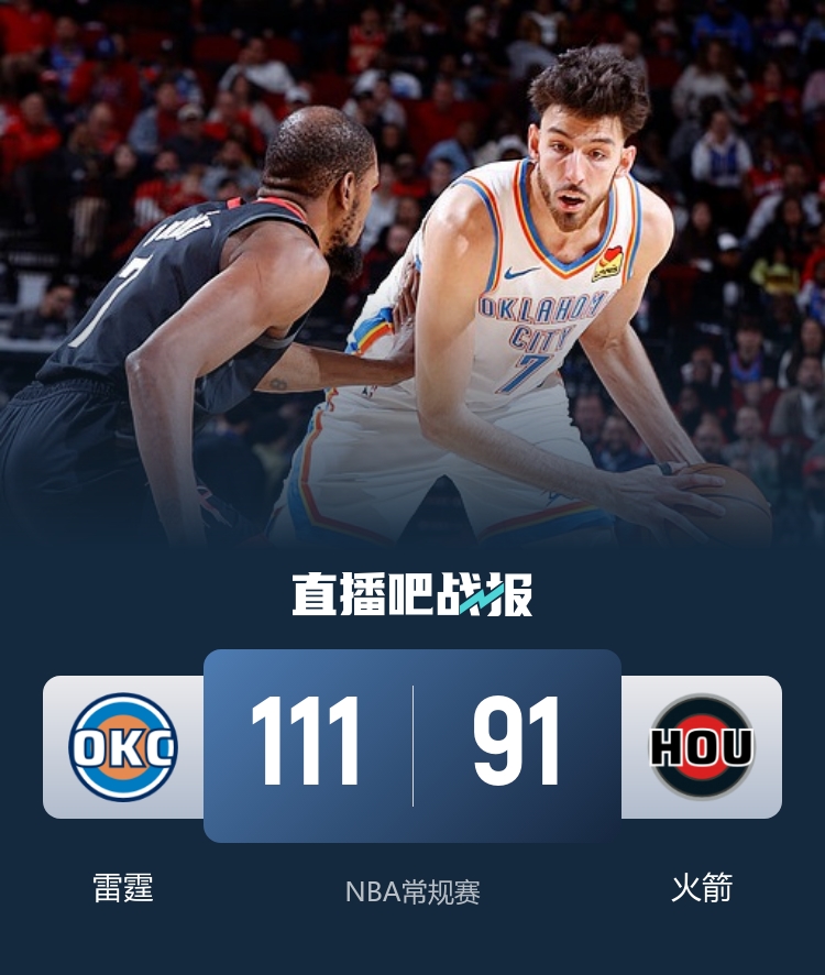 此役一上来两队专注防守,亚历山大手感不佳,但切特连投带罚予取予求,阿门联手小贾巴里·史密斯及时回应,首节结束时雷霆领先2分,次节回来,两队逐渐找到进攻感觉,申京和杜兰特率队几乎抹平分差,亚历山大突然发力连续取分,半场战罢,雷霆保持7分优势。易边再战后火箭短暂反超,雷霆多点开花迅速夺回优势,三节结束后雷霆依然领先2分,末节决战,雷霆突然下起三分雨,火箭进攻滞涩难以招架,雷霆顺势终结悬念,最终雷霆111-91双杀对手。