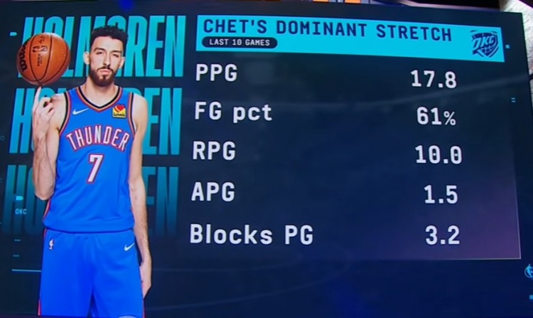 据统计,在最近10场比赛中,霍姆格伦场均可以得到17.8分10篮板1.5助攻3.2盖帽,投篮命中率高达61%!