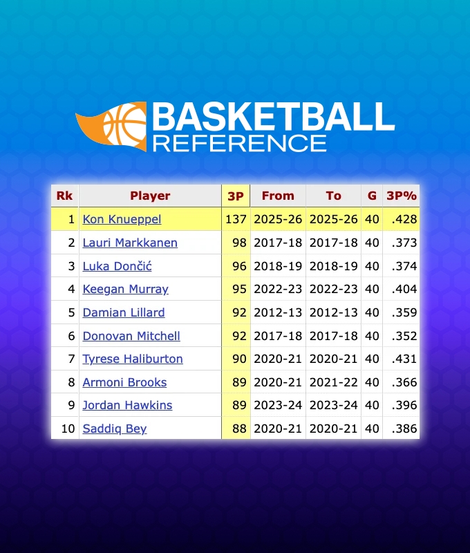 在生涯前40场比赛中,克尼佩尔投进137记三分,大幅刷新NBA历史生涯前40战三分命中数纪录,排名第二的是马尔卡宁(98记)。