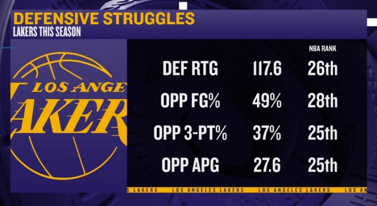 直播吧1月17日讯 今日,ESPN总结了湖人本赛季至今糟糕的防守数据: