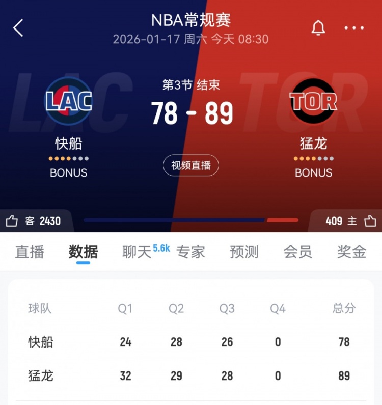 直播吧1月17日讯 NBA常规赛,快船三节打完78-89落后猛龙。