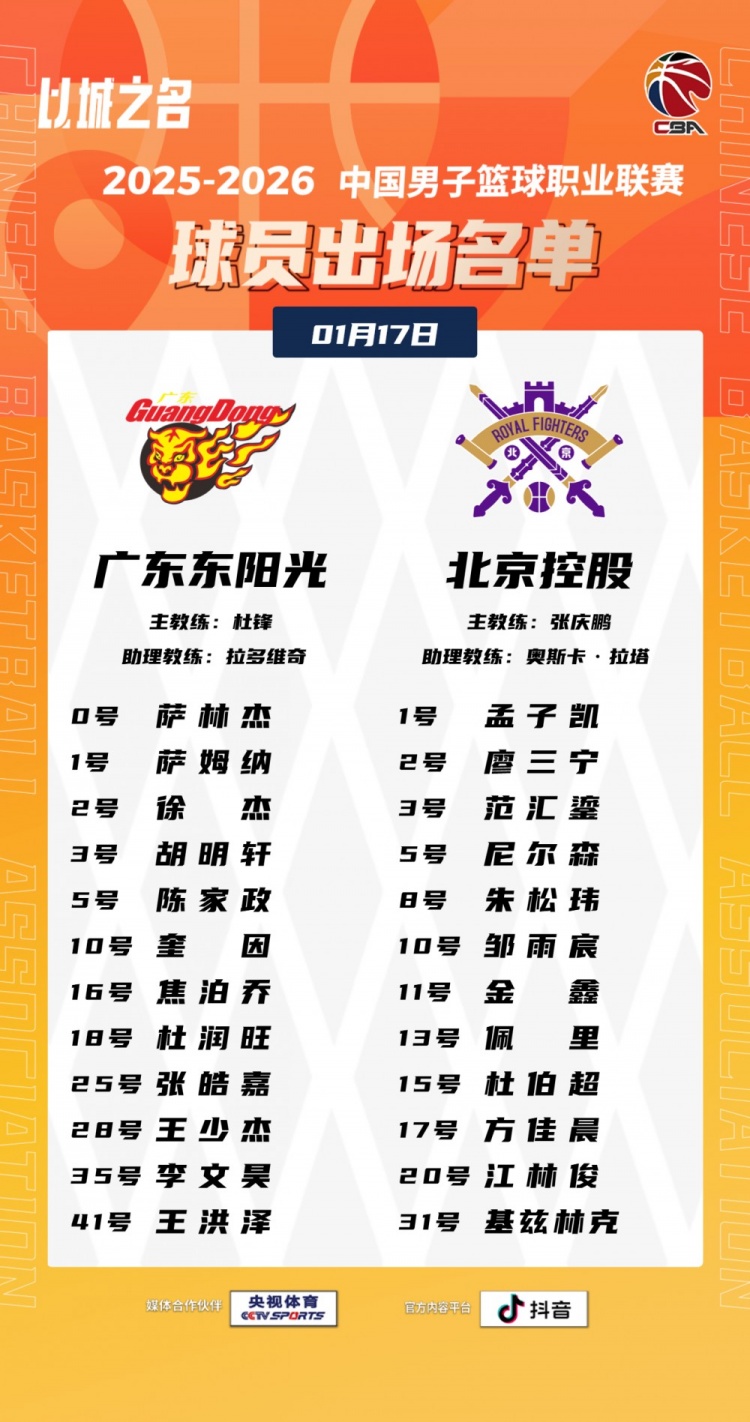 直播吧1月17日讯 今晚19:35,广东将在主场迎战北控,赛前大名单出炉。