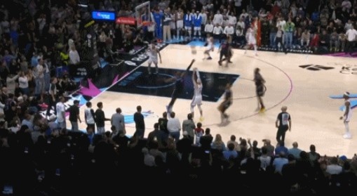 >没有绝杀成功!卡鲁索左侧弧顶接球出手压哨三分打板未能命中