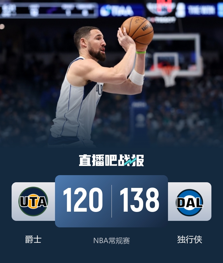 比赛开始,独行侠上来连续反击打出13-4开局,爵士外线追分,克莱连续三分回应,随后双方围绕10分左右分差展开对攻,次节双方命中率都有下降,独行侠还是保持住双位数领先,爵士全民皆兵追分,克莱连续三分还进半场轰23分,独行侠半场领先12分。下半场,乔治里突外投连续追分,但独行侠一波小高潮一度领先到20分以上,乔治再站出来单节弹无虚发爆砍19分带队单节打平,末节爵士迅速犯满,独行侠重新拉开20分以上领先,最终独行侠138-120轻取爵士。