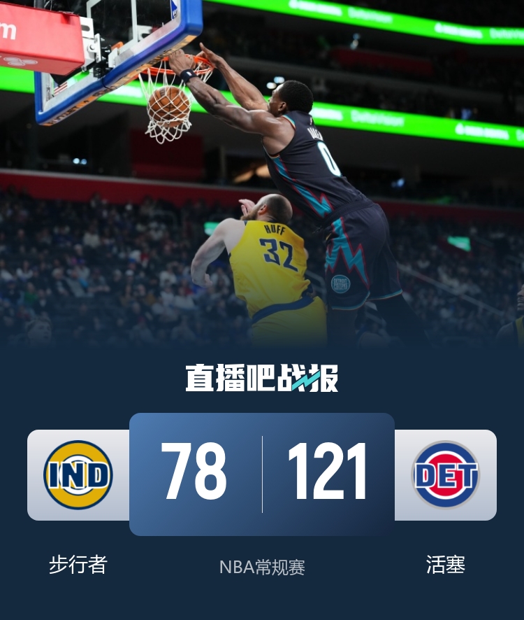比赛开始,活塞攻防两端压制对手,内外开花轰出23-2的开局,步行者得分异常困难,活塞稳扎稳打不断扩大领先,次节步行者仍无起色,外线全面哑火,活塞轻松将优势拉开到30分以上,半场战罢活塞59-24领先步行者。易边再战,步行者进攻回暖,连续三分命中,但活塞稳扎稳打牢牢占据场上主动,分差一度来到44分,末节步行者进攻回暖,但比赛早已失去悬念。最终,活塞121-78大胜步行者,主场过关。