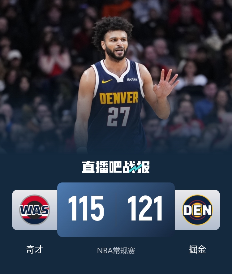 比赛开始,两队开场短暂相持,掘金持续发力打出9-0的攻击波确立两位数优势,奇才不断冲击篮筐频频得手努力追赶,次节掘金命中率下降,奇才内外开花不断蚕食分差,卡林顿反击暴扣带队反超,米德尔顿三分也有,半场战罢奇才63-62领先掘金。易边再战,两队继续缠斗,奇才延续火力一度获得8分优势,掘金内外开花迅速迫近比分,末节小哈达威连续三分命中并打成2+1帮助球队扳平比分,关键时刻穆雷内外开花带队确立优势,奇才后劲不足。最终,掘金121-115力克奇才,主场过关。