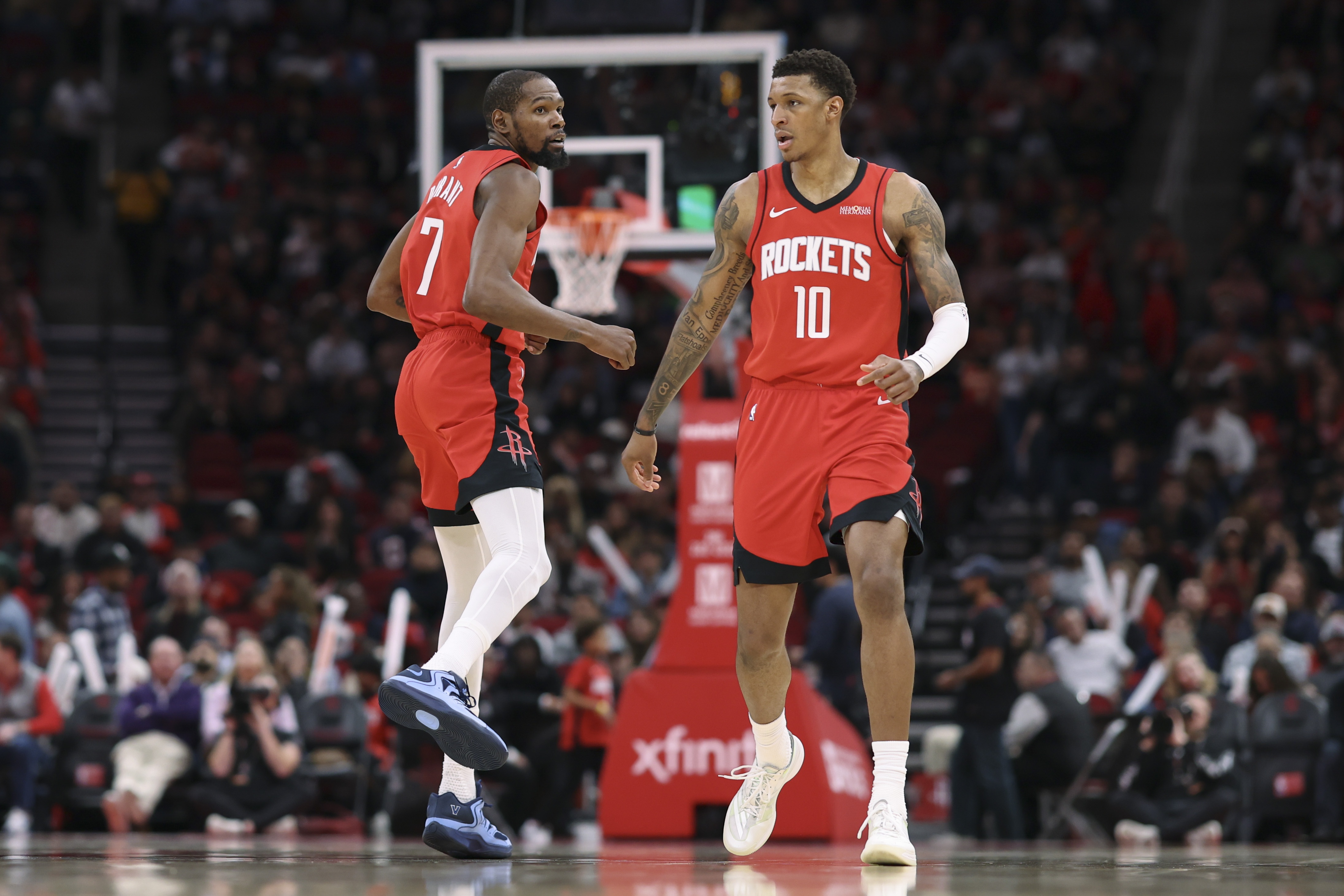 直播吧1月19日讯 火箭今日主场119-110轻取鹈鹕,杜兰特迎来里程碑,赛后在场边接受了记者采访。