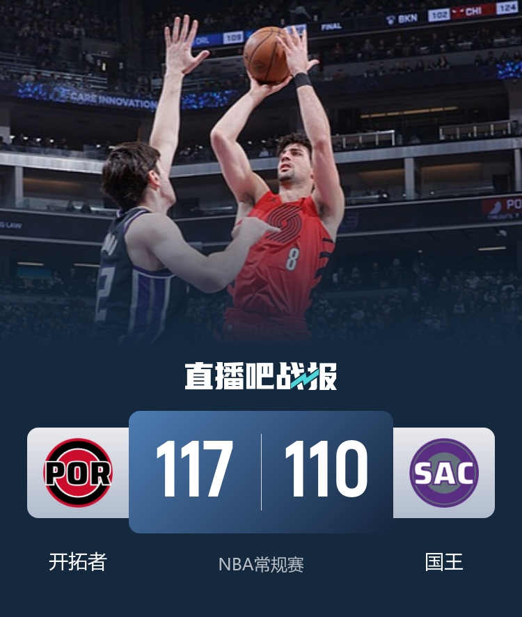 比赛开始,威少里突外投连得8分,杨瀚森上场后攻防都有贡献,阿夫迪亚状态火热单节15分,但国王7-0一度反超,首节双方打成32平,次节双方继续拉锯战,比分交替领先,阿夫迪亚联手卡马拉一波8-0建立领先,半场开拓者领先到11分。下半场,双方围绕着10分左右分差继续拉锯战,国王全民皆兵追分,夏普站出来里突外投单节14分回应,开拓者依然领先11分,末节克林根上来又连砍8分阻挡住国王追分气焰,国王3分钟内追至个位数分差,克林根关键大帽开拓者挑战成功,分差保持在两球以上,最终开拓者117-110力克国王。