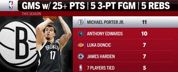 本季单场25分5板5三分榜:小波特11场第一 华子第二 077&哈登第三