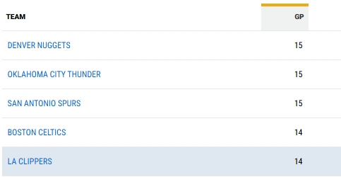 值得一提的是,此时段内,14场的胜场是全联盟第二多,仅次于雷霆、马刺、掘金的15场。而此时段内,掘金比快船多打2场;雷霆、马刺比快船多打一场。