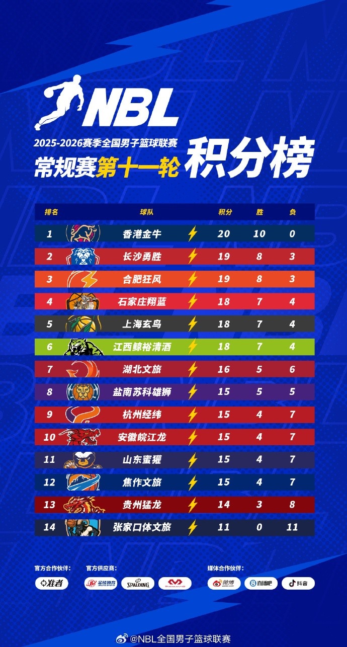 【积分榜】2025-2026赛季NBL常规赛积分榜(截至第十一轮结束)