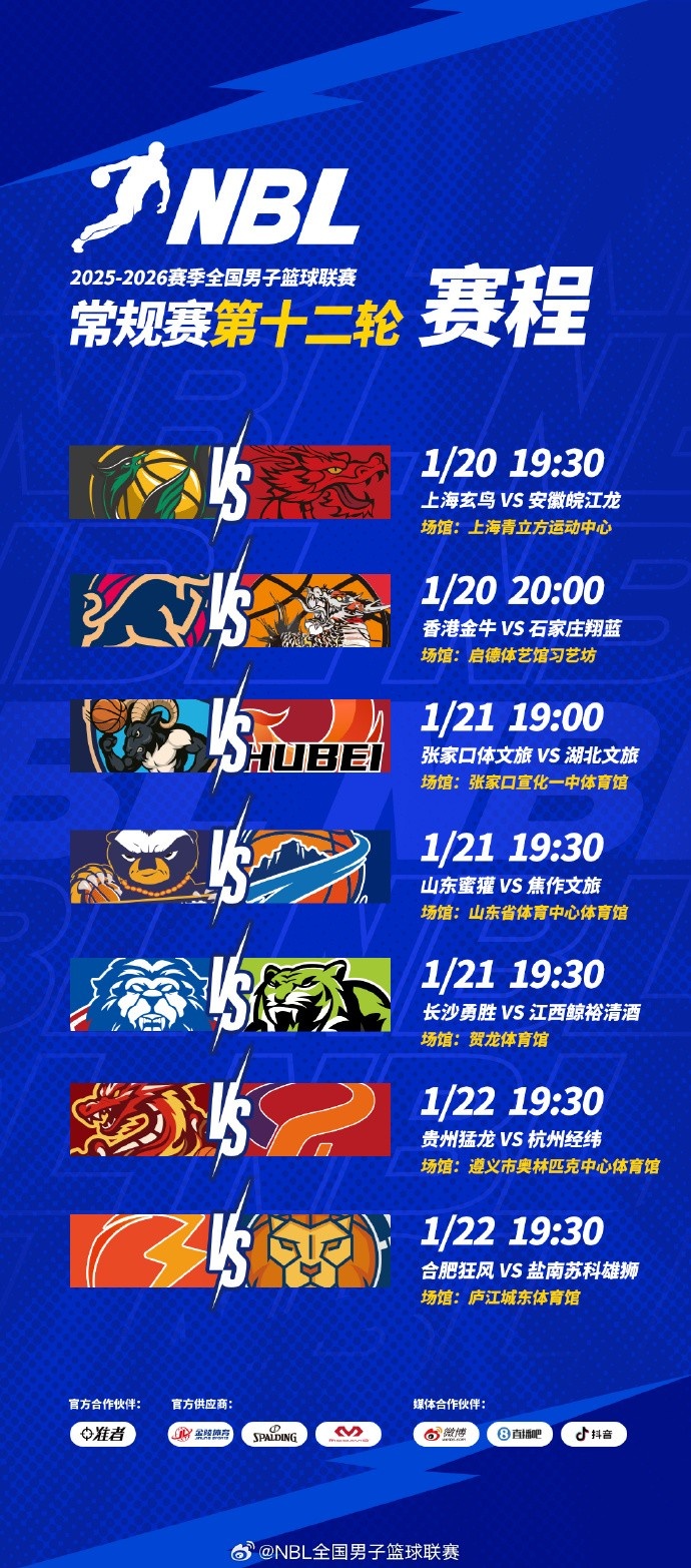 >【赛程】NBL常规赛第十二轮将于1月20日-1月22日进行!