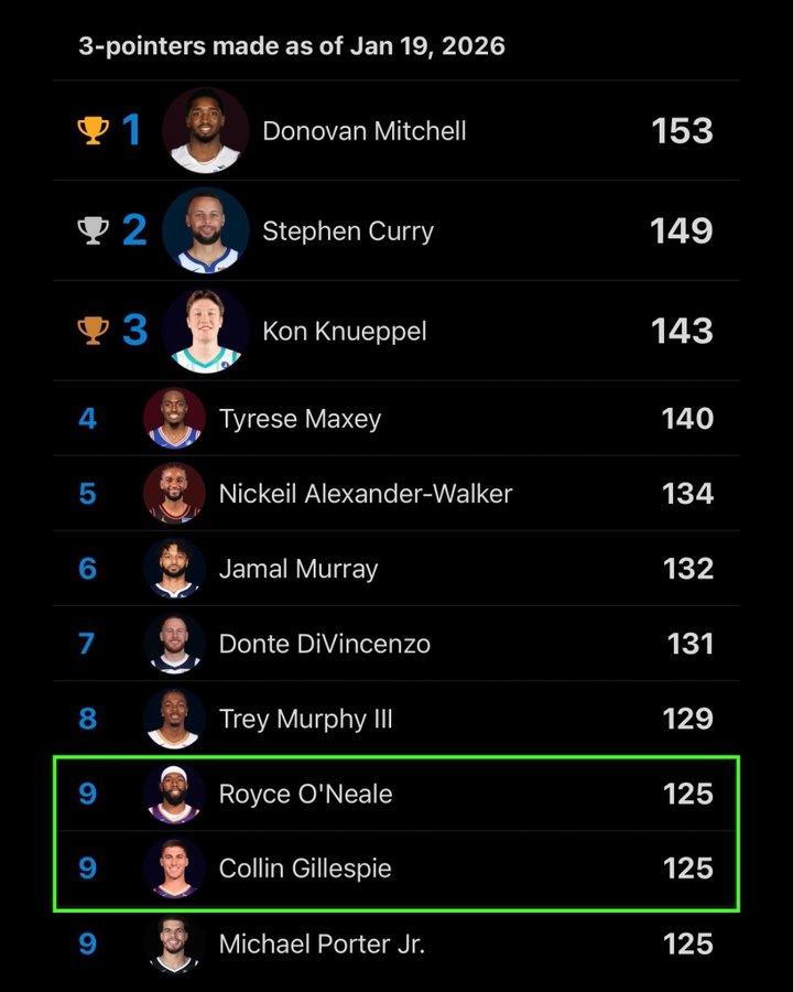 此役,罗伊斯·奥尼尔三分7中3,吉莱斯皮三分7中5。此役过后,他们本赛季三分命中数都来到125记,并列联盟第9。