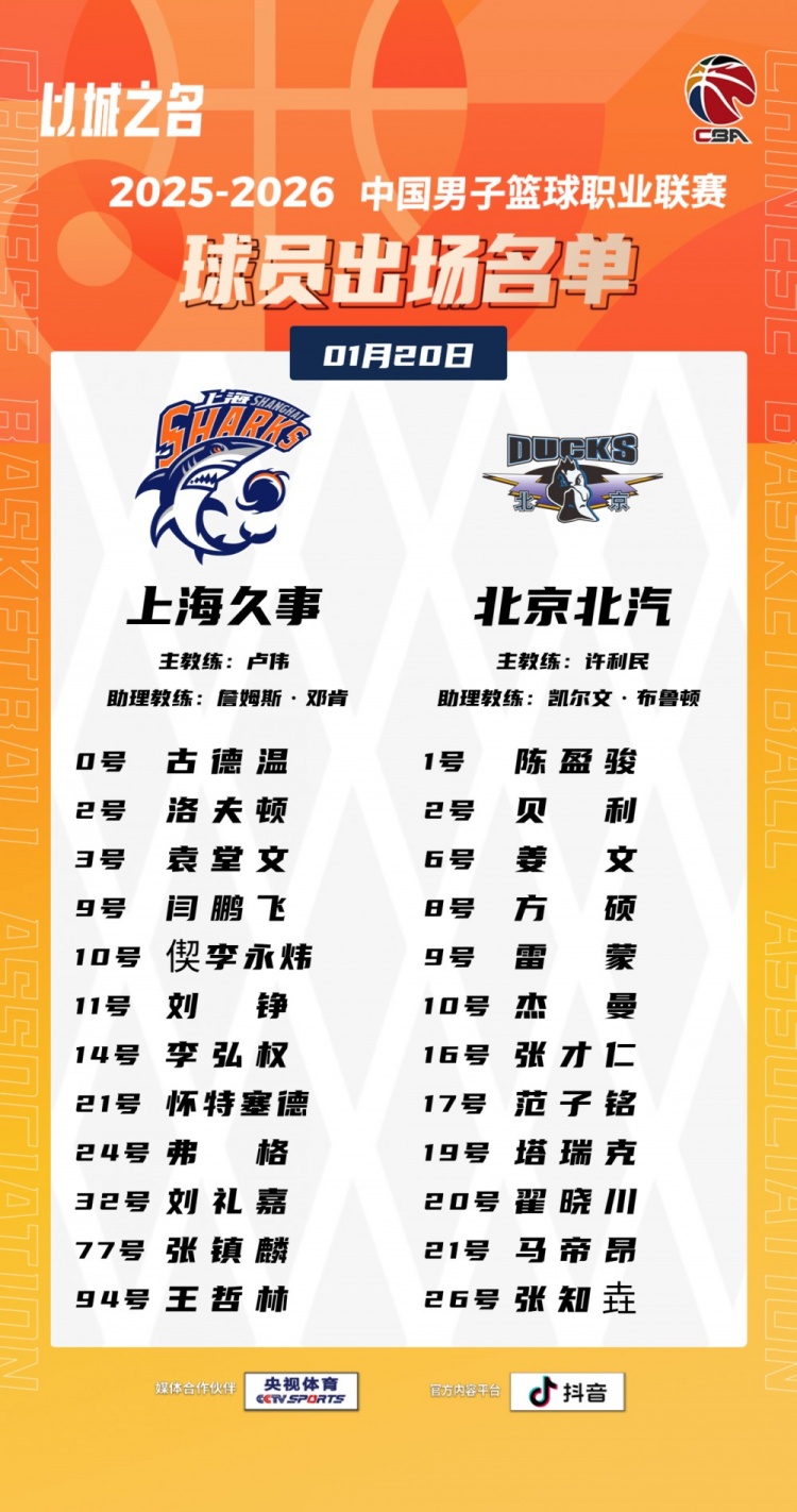 直播吧1月20日讯 19:35上海将在主场迎战北京,赛前大名单出炉。