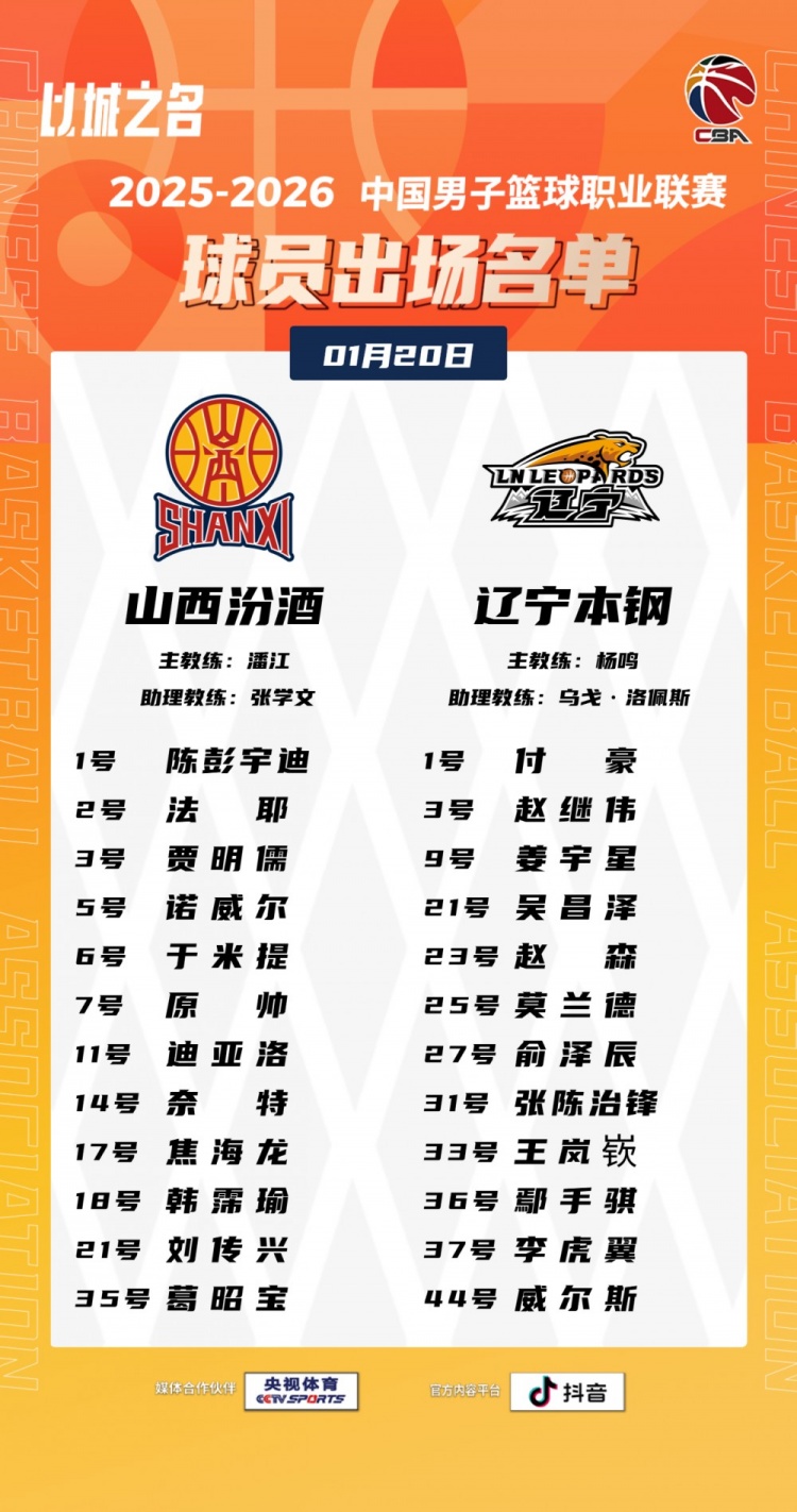 直播吧1月20日讯 今晚19:35,山西主场迎战辽宁,赛前大名单出炉。