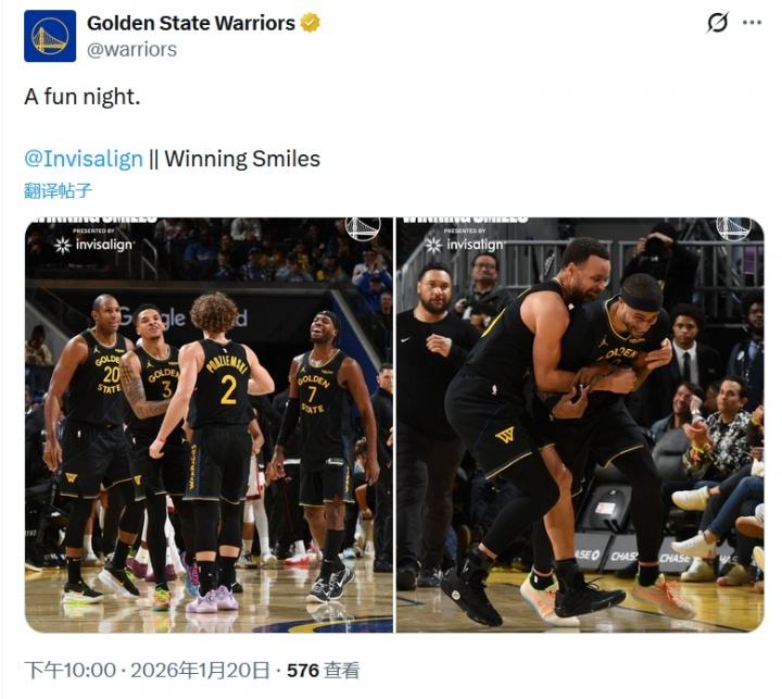 勇士官推随后晒出该场比赛的照片,并配文道:“一个有趣的夜晚。@invisalign,胜利的微笑。”