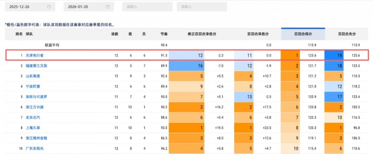 目前球队场均得分92.6分,场均失分94.8分。