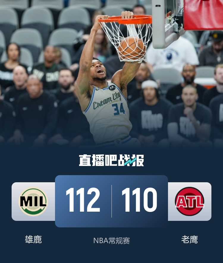比赛开场,两队进攻端都不在状态,频频出现失误和打铁情况,尤其是老鹰队单节外线13投全失,首节结束雄鹿20-19领先。次节回来,雄鹿进攻端迅速回暖,外线连续投中打出一波13-0建立领先,老鹰队则是延续首节手感,一度三分球21投0中,直到麦科勒姆投中终于破冰,老鹰半场仅得38分,以38-54落后。易边再战,雄鹿上来延续攻势,领先到20分,但随后老鹰队终于迎来手感回调,约翰逊和沃克连续取分带领球队迫近比分,三节结束仅以72-80落后8分。末节回来,雄鹿稳扎稳打维持分差,但老鹰追分的攻势更加猛烈,沃克延续手感连续投中,在终场前一分钟老鹰将比分反超,但字母哥的上篮还是让雄鹿重新领先到4分,随后沃克三分再进,罗林斯两罚一中,麦科勒姆最后一投不中,比赛结束,雄鹿112-110险胜老鹰。