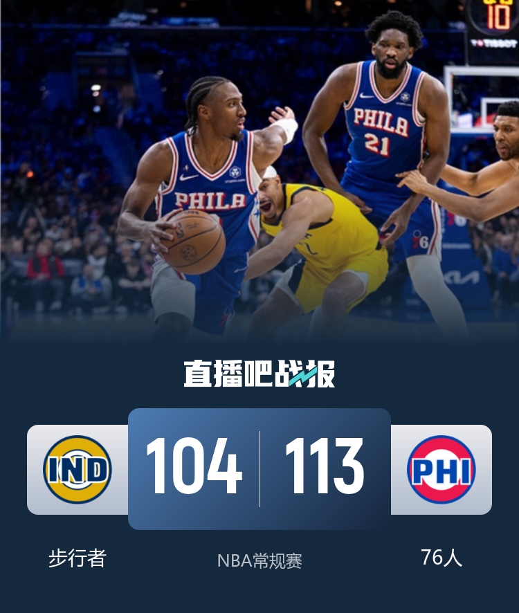 比赛开始,双方都迅速进入状态展开对攻战,比分多次打平,马克西联手恩比德撑起进攻,步行者全民皆兵回应,首节76人领先3分,次节76人进攻端受阻,步行者替补多点开花打出小高潮直接反超,乌布雷三分止血,半场步行者反超5分。下半场,乌布雷和埃奇库姆轮番取分助队反超,但步行者还是全民皆兵能咬住比分,末节西亚卡姆三分一度反超,但马克西连续抢断反击,恩比德里突外投连砍5分领先到双位数,最终76人113-104力克步行者。