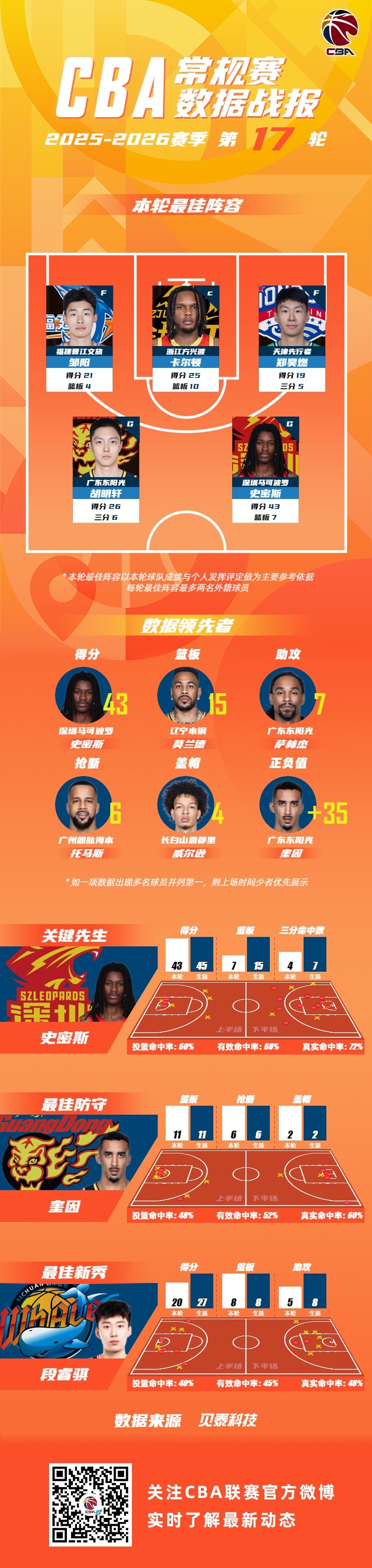 第17轮最佳新秀由来自四川蓝鲸篮球俱乐部的段睿骐获得。