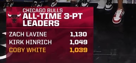 怀特已经有27场比赛中至少命中了6记三分球,这一成绩在公牛队历史上排名第二(仅次于拉文的33场)。