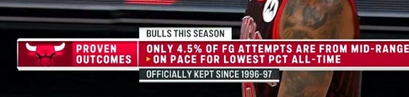 顶级魔球!公牛本赛季中距离投篮占比仅4.5% 96-97赛季后联盟最低