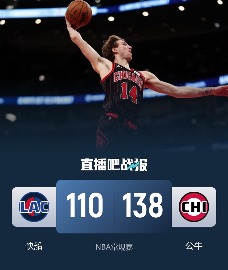 比赛开始,快船上来反客为主8-0开局,公牛接连3记三分给出回应,随后双方展开拉锯战,哈登虽然失误但造三罚后领先5分,次节公牛又是外线下起三分雨,轰下22-6攻击波直接领先到15分,快船完全被打懵,布泽利斯接连三分再进领先到21分。下半场,快船接连三分回应16-4追至个位数分差,杰伦·史密斯攻防建功,布泽利斯里突外投助队轰出13-0重新领先20分以上,末节快船直接换上替补缴械投降,公牛顺势扩大领先,最终公牛138-110轻取快船。
