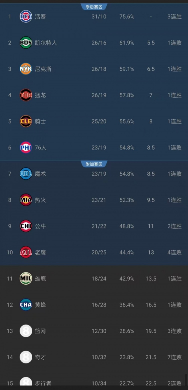 今日取胜后,骑士战绩25胜20负,连超魔术、76人,升至东部第5。