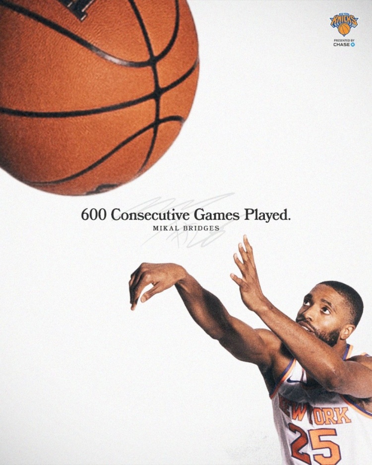 据统计,此役是布里奇斯连续第600场出战,继续刷新现役最长纪录,NBA历史连续出战纪录是由AC-格林保持的1192场,时间跨度为1986年11月20日至2001年4月19日。