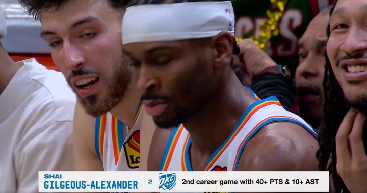 本场比赛,亚历山大出战33分钟,投篮19中16,三分2中2,罚球7中6,砍下40分7篮板11助攻1抢断,正负值+23!