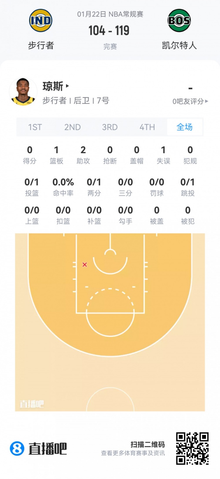 步行者次轮38号秀卡姆·琼斯 登场4.3分钟