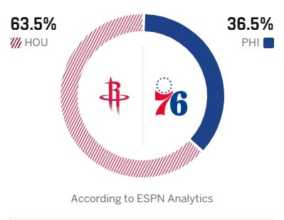 ESPN预测本场比赛胜率:火箭63.5%,76人36.5%。