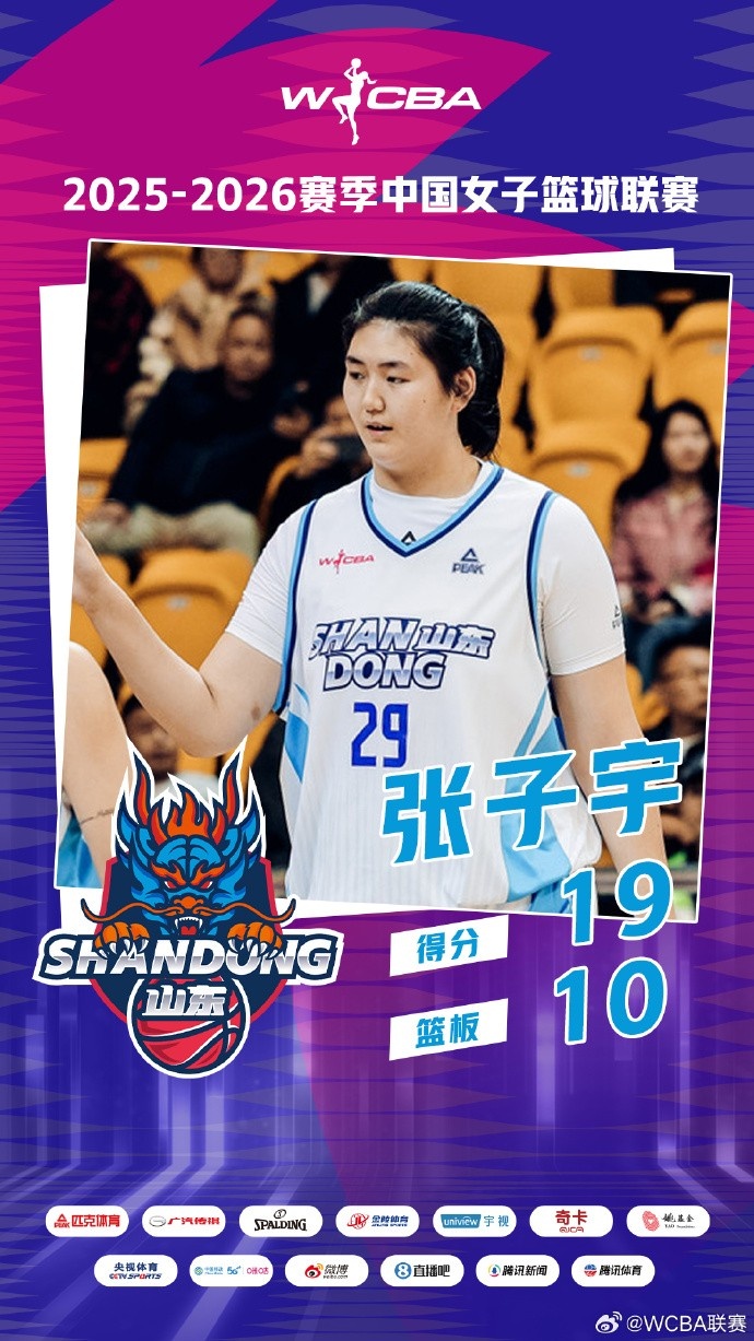 1月21日的比赛中,山东女篮张子宇全场砍下19分和10篮板,这是张子宇职业生涯首次砍下两双!