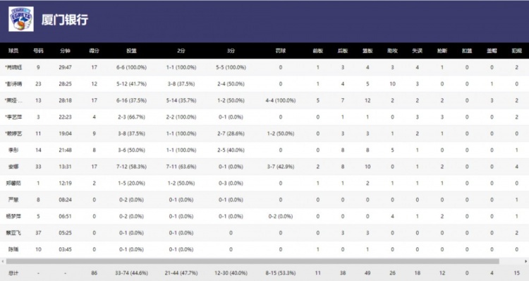末节比赛,安娜上来连续内线打成重新帮助厦门银行领先到30分以上,江西女篮继续外线强投还是不准,随后厦门银行开始有针对性的换上替补球员练兵,虽然哨声频响双方接连走上罚球线,但比赛早早就失去悬念,最终厦门银行86-49大胜江西鲸裕清酒。