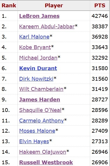 杜兰特是NBA历史小前锋得分第二(仅次于詹姆斯)