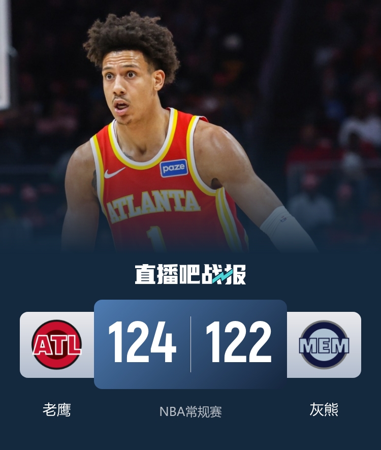 首节开打后灰熊内外结合轰出7-0开局,老鹰外线及时回应,双方你来我往比分紧咬,小贾伦·杰克逊连投带罚予取予求,首节结束时灰熊领先1分,次节回来,两队继续僵持,杰伦·约翰逊组织串联一把抓,肯纳德外线续上火力,半场战罢,老鹰反超7分。易边再战后灰熊回敬13-2攻击波夺回优势,老鹰及时复苏给予回应,三节结束后灰熊反超1分,末节决战,老鹰多点开花再度占优,决胜时刻灰熊连丢罚球,并且最后一攻前未选择暂停,莫兰特压哨绝杀未果,最终老鹰124-122力克对手终结4连败。