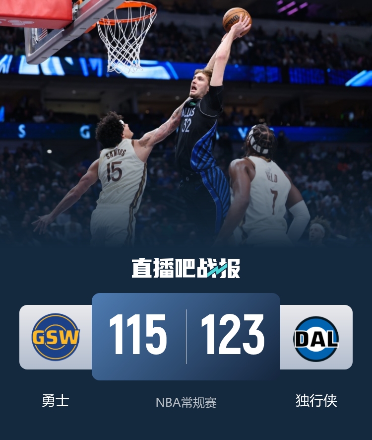 开场后独行侠打出6-0开局,库里用三记三分为勇士打开局面,随后独行侠通过积极拼抢再度取得领先,库明加替补登场连续打成2+1再度帮助勇士追上并反超比分。第二节上来两队依旧打得十分胶着,场上比分也是多次打平,库明加在一次反击后受伤离场,在半场结束前独行侠外线连中三分将比分反超,半场过后独行侠领先5分。易边再战,勇士率先打出攻势连得8分,随后场上再度陷入僵持,场上比分也是交替上升。第四节独行侠在一次暂停过后不断冲击内线打出11-0攻势建立起两位数领先,此后勇士未能再追上比分,最终独行侠123-115击败勇士取得4连胜,勇士遭遇2连败。
