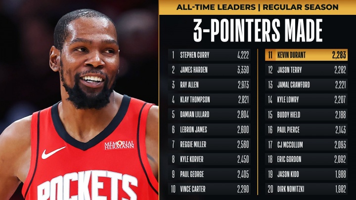 本场比赛上半场,杜兰特命中两记三分,生涯三分数来到2283个,超越贾森·特里,升至NBA历史第11,排在第10的是文斯·卡特(2290个)。