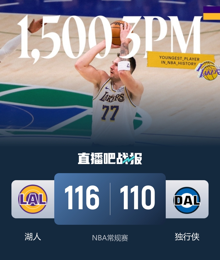 湖人(27-17):东契奇33分8板11助、詹姆斯17分8板5助、八村塁17分8板1助、斯玛特13分7板3助2帽、拉拉维亚13分6板1助、艾顿9分11板、范德比尔特8分4板2助、海斯6分1板1助、蒂米3板1助2断、文森特1板1助2断。