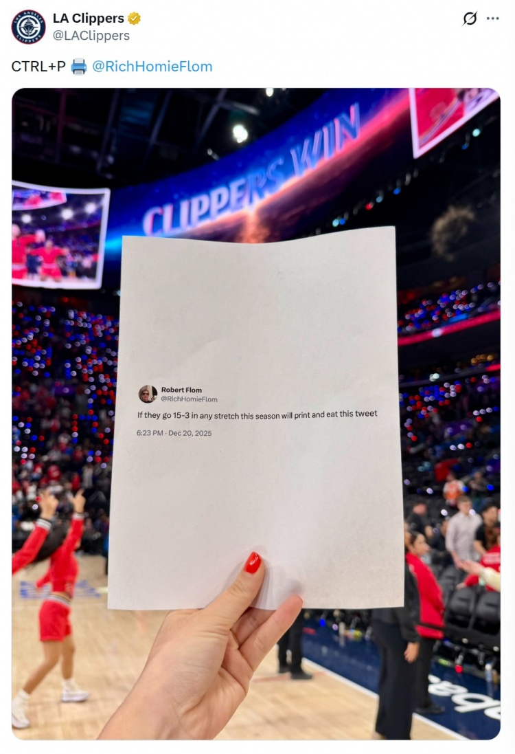 此前,一位网友曾表示,如果快船本赛季能够在任意阶段取得15胜3负,他将打印这条推文并吃掉,这段推文今天被展示在快船的球迷墙。